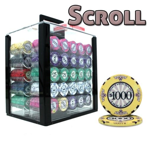 These Scroll ceramic poker chips feature Victorian style flourishes around the outer border and large, easy to read denominations in the center. Ceramic chips are of a much higher quality than composite or even most clay composites and have a smooth surface with the graphics directly printed on the chip as opposed to an inlay or sticker used on clay chips. The Scroll is a classy look for any poker chip enthusiast and offers a true casino quality look and feel. Each ceramic chip weighs approximately 10 grams and is available in the following denominations: 50 cent, $1, $5, $25, $100, $500, $1000 and $5000.