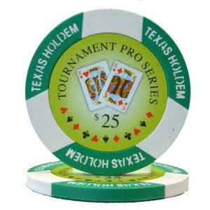 These Tournament Pro style poker chips offer a unique design and casino feel. They contain a beautiful textured inlay that will make your chips the best on the block. Each clay composite chip weighs approximately 11.5 grams and is available in the following denominations: $1, $5, $10, $25, $50, $100, $500, $1000, $5000 and $10000.